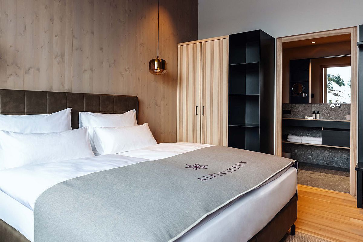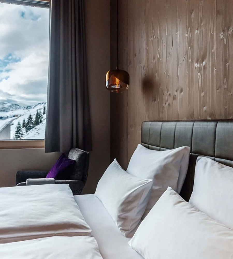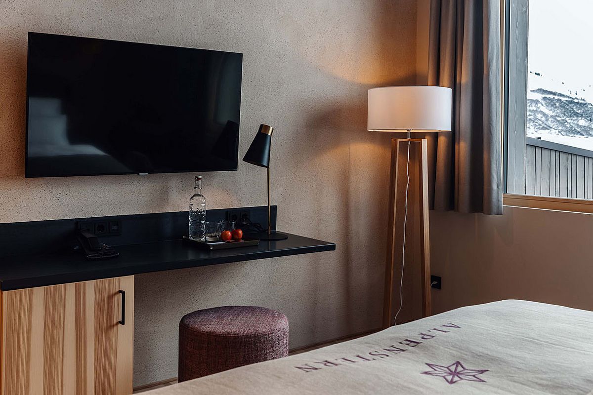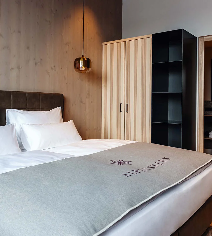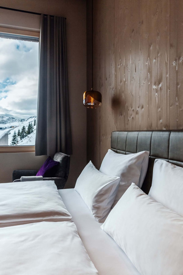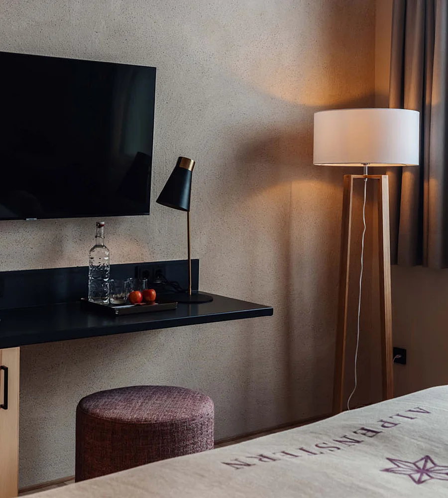 Close the door. Leave the outside world behind. Yet still see and feel nature. Wood, stone, wool, mountains. Retreat into the cosy king-size bed and experience a sense of peaceful seclusion whilst enjoying a relaxing shower. Let your thoughts wander as you gaze upon the majestic Furkajoch.