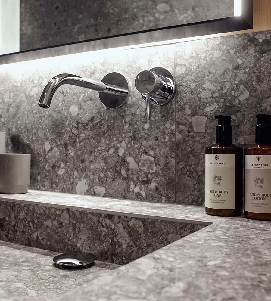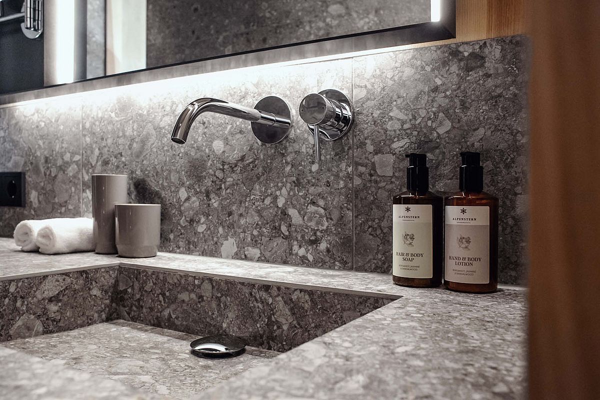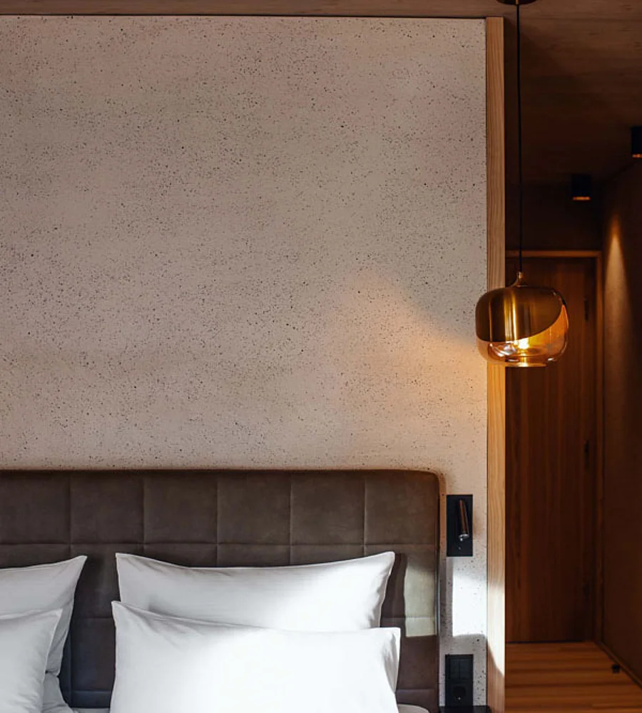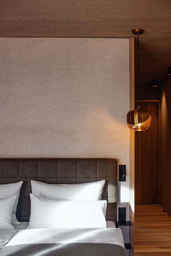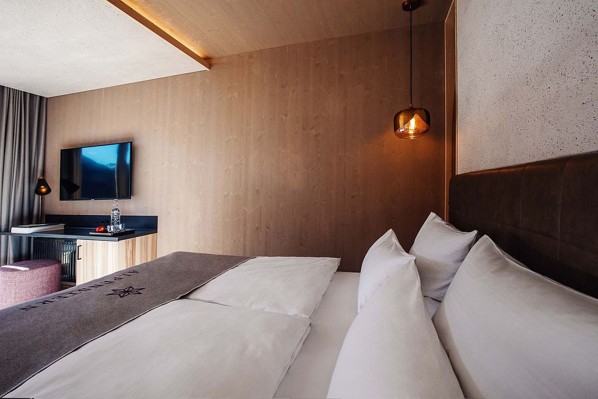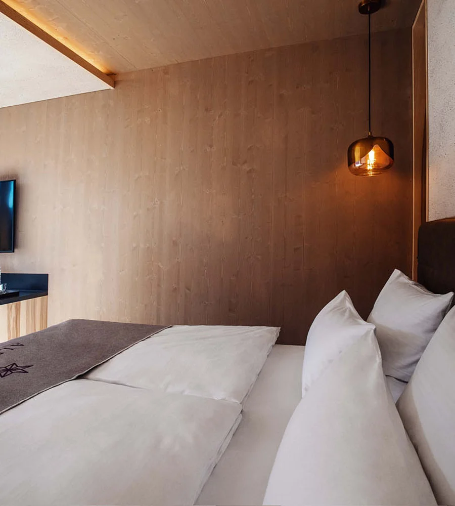 A space crafted from wood, stone and water. A design that soothes the eye. Everything you need is right here for you. Find your centre whilst snuggling up in the luxurious king-size box-spring bed, enjoying a long rain shower, or simply taking in the magnificent view of the mountain landscape from the south-facing balcony.